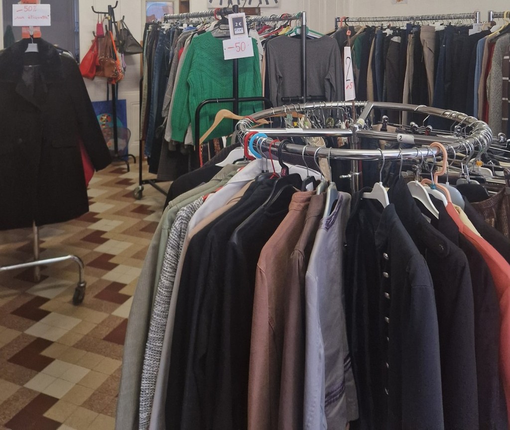 La vestiboutique fonctionne comme une boutique ordinaire — à ceci près que les prix sont symboliques et que chaque achat finance des actions de solidarité locales. Les rayons proposent régulièrement :