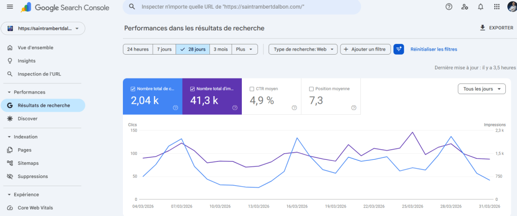 - Google Search Console, données saintrambertdalbon.com, mars 2026 (mois complet, 04/03-31/03/2026)